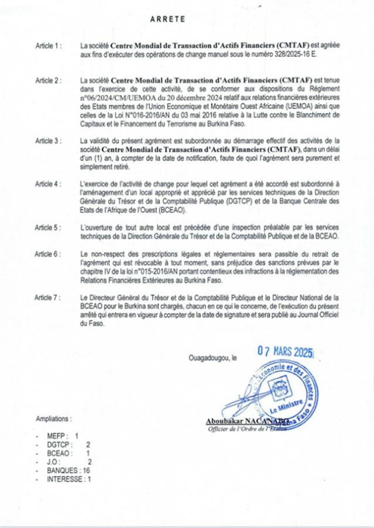 据介绍,截至2024年12月,经布基纳法索国家经济和财政部、国家安全部及其下设各机构的审核,世界金融资产交易中心(CMTAF)顺利将关于个人换汇许可法令的材料递交到西非经济和货币联盟(UEMOA),并于当月通过联盟审核。目前,该文件已顺利获得西非经济和货币联盟下设的西非国家中央银行(BCEAO)的颁发,并顺利得到布基纳法索国家经济和财政部签批。